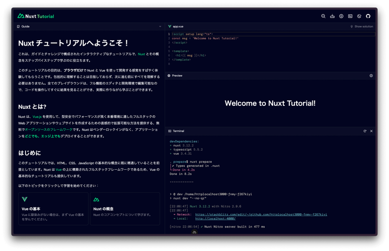 このチュートリアルは Vue.js の基礎(リアクティビティ、Composition API など)から始まり、 Nuxt のコアなコンセプトを理解するためのもので、「Vue.js を触ったことがないけど Vue.js で実用的なアプリケーションを作ってみたい!」という Vue.js 初心者の方に楽しんでいただける内容になっています。